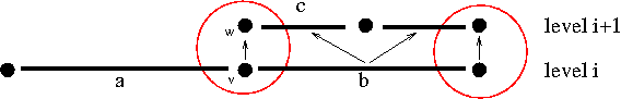 An exception to this rule holds for entities that are copies of entities on a lower refinement level. An element is a copy of its father element if it is the only son. This concept can be transferred to all higher codimensions because in a nested grid structure the entities of any codimension form a set of trees. However, the roots of these trees are not necessarily on level 0. Thus, we define that an entity is a copy of another entity if it is the only descendant of this entity in the refinement tree. This is illustrated in the following figure where, for example, vertex w is a copy of vertex v.